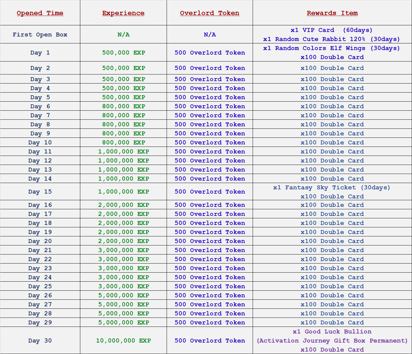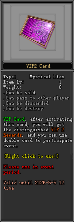 - VIP Card will be grant duration for last 60 days after open from the VIP Gift Box.
