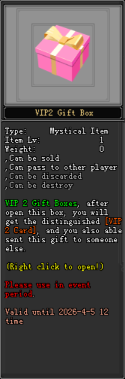 - The New VIP Card Gift Box 2 is available to purchase in Imperial Street Mall - Holy Mall with price: 8750 Jpoints